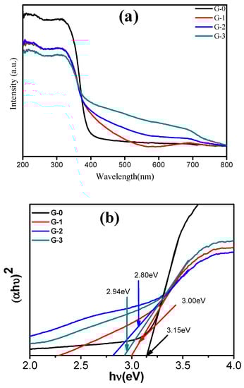 Diffuse reflectance spectra of TiO2 and Cu-doped TiO2are shown in Figure 2. The absorption edge for pure TiO2 (G-0) and Cu-TiO2 (G-1, G-2 and G-3) were observed around 393, 413, 442, and 426 nm, respectively. The band gap values calculated using the Kubelka–Munkfunction were found to be 3.15, 3.00, 2.80, and 2.94 eV, respectively [40]. Figure 2b depicts the Tauc’s plot for band gap calculations. It is observed that G-2 sample (2% Cu-TiO2) hasa band gap of 2.80 eV. Doping of Cu atom substitutes some of the Ti site in the TiO2lattice, which leads to a strong d–p coupling between Cu and O. This leads to an upward movement of O 2p orbital, resulting in reduction of the band gap. Further, Cu 3d orbital forms an impurity band above theTiO2 valence band and causes a reduction in the overall bandgap.