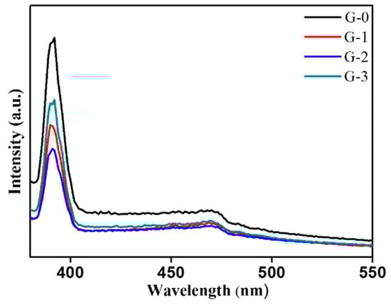 Photoluminescence spectra of pure TiO2 (G-0), Cu-TiO2 (G-1, G-2, and G-3).