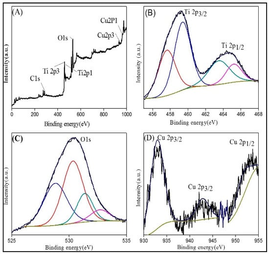 XPS spectra for G-2. (A) High resolution spectra, (B) resolution spectra for Ti, (C) resolution spectra for O, and (D)resolution spectra for Cu.
