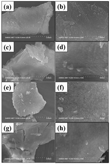 FE-SEM images for pure TiO2 G-0 (a,b), Cu-doped TiO2 G-1 (c,d), G-2 (e,f), and G-3 (g,h).