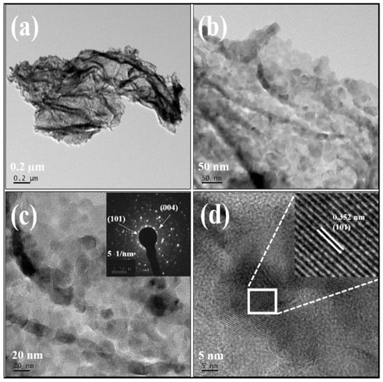 The low and high resolution FE-TEM images of G-0 (Figure 6a–c) and G-2 (Figure 7a–c) nanostructures, along with selected area electron diffraction pattern (Figure 6d and Figure 7d) shows a highly crystalline interconnected nanoparticle network. The SAED image validates the formation of anatase TiO2 and supports the XRD analysis. The pristine sample depicts formation of spherical shaped (20–30 nm) particles aligned with each other, forming a wavy structure. This dense particulate wavy monolayer structure looks like a graphene sheet (Figure 6a). The FE-TEM of G-0 and G-2 samples (Figure 6d and Figure 7d with insets) depict an inter-planar distance of about 0.352 nm, corresponding to [101] plane. This confirms the existence of anatase TiO2. Overall, the TEM analysis confirms the formation of nano-sized Cu-TiO2 particles having good linkage with adjacent particles.