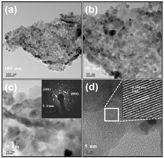 (a,b) FE-TEM images of pure TiO2, insets of (c) and (d) are the SAED and high-resolution TEM.