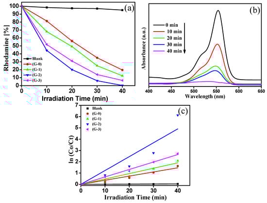 The plot of %RhB vs. irradiation time is shown in Figure 8a. Pure TiO2(G-0) shows 80% of RhB degradation within 40 min, whereas the G-2 (2% Cu-doped TiO2) sample shows complete degradation of the RhB solution under the identical experimental parameters. The UV-visible absorbance spectra of RhB with time using G-2 sample is depicted in Figure 8b. From these spectra, the %RhB recovered was calculated with respect to irradiation time. The G-2 sample shows the highest photocatalytic performance as compared to other prepared compositions. It is reported that the photocatalytic dye degradation reaction shows pseudo-first order reaction kinetics. The chemical kinetics of RhB degradation was studied using the Langmuir–Hinshelwood model. The slope of the graph of ln(C0/Ct) vs. irradiation time gives the value of apparent rate constant (Kapp). The graph of ln(C0/Ct) vs. irradiation time is shown in Figure 8c. The reaction rates of photocatalytic RhB degradation using TiO2 and Cu-TiO2 catalysts are tabulated in Table 1. The G-2 sample shows an apparent rate constant (kapp) of 12.28 × 10−2 min−1 for RhB dye degradation which is almost three times higher than that of pure TiO2.