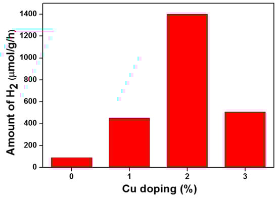 Furthermore, for improving catalytic activity, transition metal doping with Cr, Fe, Cu, Co, and Ni is inexpensive [24], effective, and thermally stable [25,26]. Transition metal doping is a simple and effective way for broadening of absorption spectra towards visible light. As compared to other metal cation doping, copper (Cu) is a promising dopant due to its availability with variable valence oxidation states (+1, +2), as shown in Equation (1) [27] resulting in higher photocatalytic H2 production.