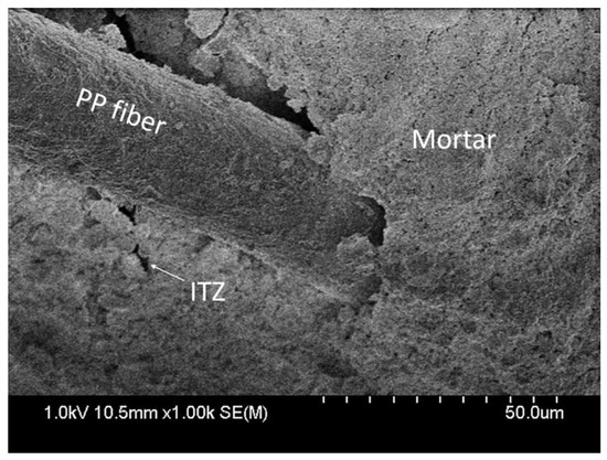 Scanning electron microscope (SEM) image showing polypropylene fiber, interfacial transition zone (ITZ), and mortar.