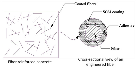 A major issue associated with using synthetic fibers is caused by their lack of hydrophilicity. They react very little with the concrete matrix and consequently, loading is hardly transferred from the matrix to the fibers [1]. Another major challenge is the interfacial transition zone (ITZ). Figure 1 shows that owing to the “wall effect”, the matrix around macroscopic particles such as aggregates and fibers does not pack as efficiently as in the rest of the matrix [6,7]. Poor bonding between the aggregates/fibers and the cement matrix generates a weak ITZ [8] that hinders full exploitation of the fiber strength [6]. To address these shortcomings, many approaches have been investigated. These are described below.