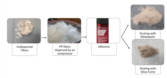 In this study, a novel method to surface treat the PP fibers with SCMs is proposed. The core of this method is based on an invention by Gupta titled “Surface Treatment for Concrete Reinforcement” [29]. The focus of this research was to investigate the effectiveness of surface-treating fibers for improved bond strength. The proposed method utilizes pozzolans including silica fume and metakaolin. The presence of such pozzolans is usually expected to improve the strength of the matrix. Instead of adding to the entire mix, these pozzolans targeted only in the regions requiring their use in ITZs surrounding the fibers [29]. To achieve this, a new method is developed which disperses the PP fibers, applies adhesive to every fiber, and adheres pozzolans to the fibers (Figure 2). In addition, one commercially available repair material is used as the base material where the surface-treated fibers are added. Repair materials are now widely used to extend the lifetime of structures and thus have a greater need for maintaining the safety and serviceability [30]. Most of these repair materials comprise a component of cement, polymer, and at times, both [30,31,32]. The base material in this study is classified as a cementitious repair mortar.