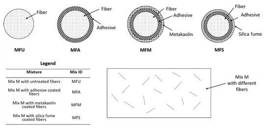 The various mixes were prepared to capture the effect of incrementally adding layers of coating on the virgin fiber. The first mix contains uncoated virgin PP fibers, the next mix contained the adhesive layer only, the succeeding mix contained metakaolin coated over the adhesive, and the final mix contained silica fume coated over the adhesive (Figure 4). As discussed in earlier sections, the commercially available repair mix P already contains fibers. Hence, no additional mixes were prepared with mix P. Instead, the mix was used as is to serve as a comparative mix to this study. Table 1 lists the mix designs and the number of samples cast for each mix.