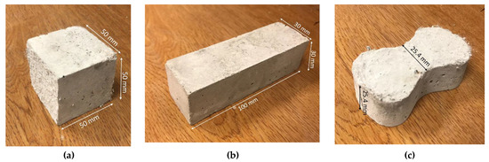 Specimens cast for testing: (a) mortar cube, (b) beam, and (c) dog-bone/coupon.