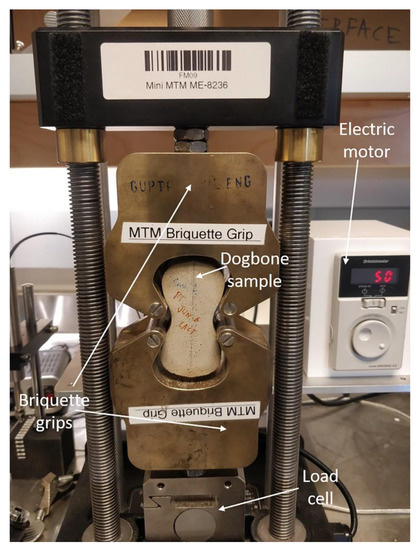 Specimens were taken out of the curing tank and allowed to attain saturated surface dry condition before carrying out tests. A total of at least 6 specimens per mix were molded. The test was conducted using PASCO® Materials Testing Machine ME-8236 used in conjunction with briquette grips. The machine had a load cell capacity of 7100 N. In its original capacity, ME-8236 operates using a manual crankshaft, to regulate the process of controlling speed and load rate. The machine was modified by adding an electric motor BMUD60-A2 from Oriental Motor®. The setup is shown in Figure 6 below. The motor comprises a brushless DC Motor Driver compatible with a single-phase 100–120 VAC power supply. Using the motor, the speed was set to 50 rpm, which translated to a displacement rate of 0.5 mm/min on the briquette sample. This automation in the machine resulted in a much more constant loading rate. The machine was coupled with the PASCO® 550 Universal Interface to connect to the PASCO Capstone software. The deflection of the coupon samples was determined by the software from the number of rotations made by the threads of the machine. The deflection and loads were recorded at a sampling frequency of 25 Hz. The direct tensile test was carried out at 14 and 28 days of curing and six specimens were tested for each age.