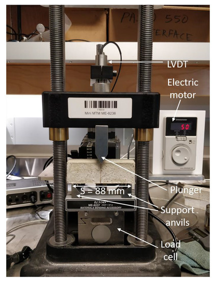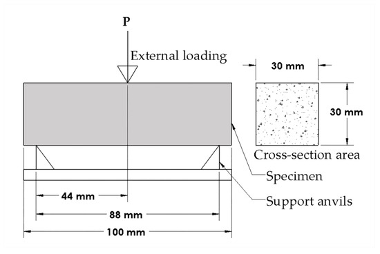 where = modulus of rupture in MPa, P = peak load applied on the beam in N, S = support span in mm (kept constant at 88 mm for the study), b = width of the beam ( 30 mm), and d = depth of the beam (30 mm).