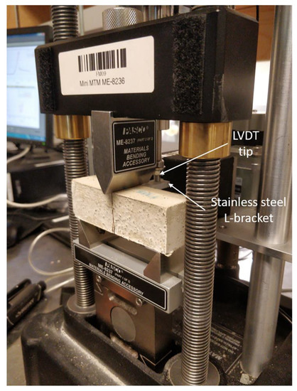 Mortar beams were cast to determine the flexural strength (modulus of rupture). To carry out flexural strength tests using the three-point bending setup, the same PASCO® ME-8236 equipment as described above was used. The briquette grips were replaced by the ME-8237 materials bending accessory provided by PASCO®. The accessory included a plunger and adjustable support anvils. For this study, the span length between the anvils was kept constant at 88 mm (Figure 7). Displacement measurements were recorded with the help of the LD620-25 linear variable differential transformer (LVDT) produced by OMEGA®. The LVDT had a range of 25 mm with an excitation voltage of 10–30 Vdc @ 25 mA and had an output of ± 5 Vdc with a bandwidth of 500 Hz. The LVDT was kept in contact at the midspan of the beam with the help of stainless-steel L-brackets attached to the beams using fast-setting epoxy resin (Figure 8). A total of at least 6 specimens per mix were cast. Three-point bending tests were conducted at a strain rate of 0.5 mm/min at 14 and 28 days of curing. Three specimens were tested at each testing age.