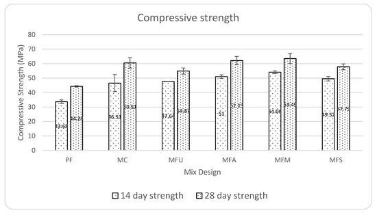 Figure 9 shows the results of the compressive tests done for all the mixes measured at both 14- and 28-day strength. Average compressive strength is presented for various mixes with error bars.