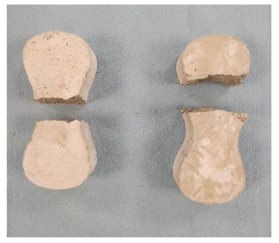 Mortar cubes were cast in accordance with ASTM C109 [37]. Each of the cubes (50 mm in size) was cast in two layers with a hand tamping technique used for consolidation. A total of 6 cubes for each mix were cast for determination of compressive strength. Briquette samples prepared were cast and tested to determine the tensile strength of the mixes. The briquettes had a cross-section of 645.16 mm2 at the neck. Briquette molds used were in accordance with ASTM C307 [38]. Both the width of the neck and thickness was 25.4 mm as per the provisions of ASTM. A total of 6 specimens for each mix were prepared to test the tensile strength. In addition to the ASTM standard tests on mortars as stated above, beams of size (30 mm × 30 mm × 100 mm) were cast. Figure 5 shows the cast specimens of each type. These specimens were prepared to determine the modulus of rupture in flexure for each of the mixes. A total of 6 beams were prepared for each mixture type. Immediately after molding, specimens were sealed in plastic sheets to minimize the evaporation of moisture from the fresh mix. Specimens were stored at 23 ± 2 °C for 24 h before demolding. Demolded samples were stored in water at a temperature of 23 ± 2 °C. All the mixes were immersed in separate water containers to avoid cross-contamination from the effect of leaching of free lime or constituents of SCMs.