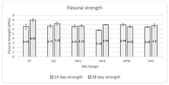 Figure 14 shows the flexural strength results of the mortar beams for all the mixes measured at both 14- and 28-day strength. Average flexural strength is presented for various mixes with error bars.