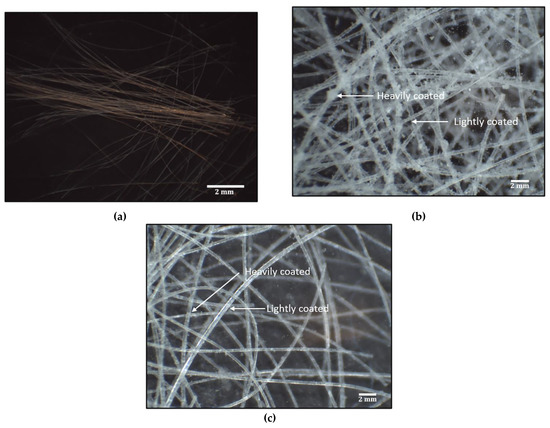 Figure 15 shows a preliminary investigation on the coated fiber samples using optical microscopy. A scale bar is also included in the images. Figure 15a shows virgin untreated polypropylene fibers without any coating, Figure 15b shows polypropylene fibers treated with metakaolin coating, and Figure 15c shows silica fume-coated polypropylene samples. Visually in Figure 15b,c, it appears that the fiber is uniformly coated either heavily or lightly with the SCM. Even distribution and uniformity of pozzolan material is further investigated under an SEM in Section 3.5.