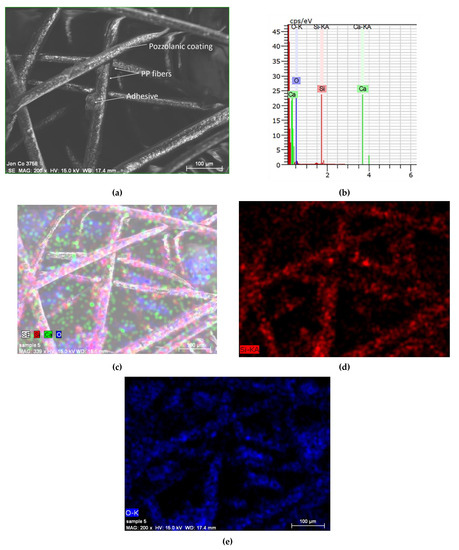 After the SCM coating procedure was carried out on fibers, they were analyzed under an SEM and energy dispersive X-ray spectroscopy (EDS). The microscopy images revealed the presence of a varying concentration of SCM on the fiber surface. However, pozzolanic materials seem to be present throughout the surface. Since the effect of ITZ is progressive and is most significant in the first 15–20 µm closest to the reinforcement [6], even a small amount of coating can be sufficient to provide the desired results. The evenness of the coating was not visible using optical microscopy owing to the fine nature of the particles of the SCMs used; however, it was evident under the SEM. Figure 16a distinctly shows the coating of metakaolin as brighter spots on the surface of the fiber. Bruker Quantax (EDS) System was used for X-ray spectroscopy to reveal the elements in the sample. The spectroscopy revealed peaks corresponding to elements such as silicon, oxygen, and calcium. The equipment demonstrates the ability to show the true spatial distribution of each element of interest in the given sample. The magnification level was set at 200× with an accelerating voltage of 15 kV and a working distance of 17.4 mm for the parent image. Using Figure 16a as the parent image, elemental mapping was done on it to reveal the positioning of the elements which showed spectrum peaks (Figure 16b). The elemental mapping revealed the positioning of silicon (shown in Figure 16d) and oxygen (shown in Figure 16e) from the pozzolan (metakaolin) on the fiber surface. As indicated by the datasheet of metakaolin and other studies [48], it was inferred that the primary components in metakaolin were oxides of aluminum and silicon. Elements such as silicon and oxygen, which corresponded to the peaks in Figure 16b, are seen with their spatial distribution in Figure 16d,e. Figure 16d,e shows the distribution of the constituents of the SCM. Outline of the fibers in the parent image can be made out in the images showing elemental mapping, indicating the presence of SCM on the surface of the fiber.