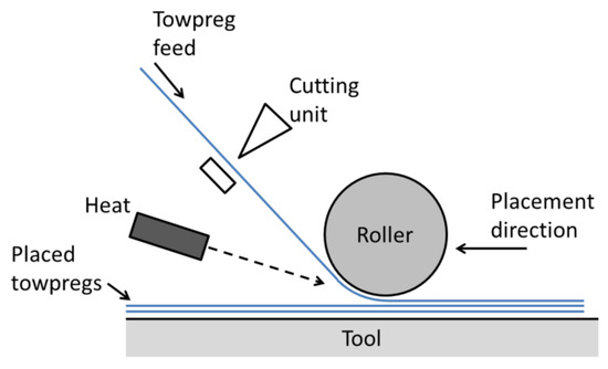 In the AFP process, FRP towpregs are laid in the desired orientation using a robot arm. A schematic of the AFP process is shown in Figure 1. AFP produces laminates with more precise and consistent fiber orientation compared to conventional manual processes. The towpregs can be placed in straight strips or a curved fashion. AFP processes have been used to fabricate variable stiffness FRP laminates, i.e., laminates with curvilinear configurations, to improve the laminate’s buckling performance [10]. Factors affecting the quality of components fabricated using AFP include the processing temperature, the type of heat source, the fiber placement rate and the compaction pressure [11,12].