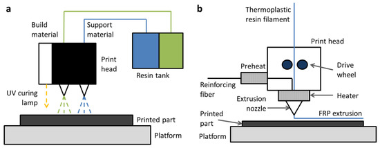 Schematic of additive manufacturing processes for fiber-reinforced polymer composites: (a) material jetting and (b) fused deposition modeling.