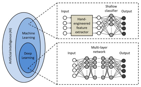 AI can be defined as “the study of the design of intelligent agents”, where an intelligent agent is “a system that acts intelligently” [22]. ML is the technology of using a learning algorithm and data to solve problems. The learning can be in the form of supervised learning, unsupervised learning, or reinforcement learning [23,24]. Conventional ML methods are mainly supervised learning with shallow classifiers that take inputs from hand-engineered feature extractors [8,9]. Conventional ML methods achieved some success in simpler tasks, but for more complicated problems, building the feature extractors became very difficult. One of the main challenges is termed the “selectivity-invariance dilemma” where the algorithm needs to differentiate between features that are important and unimportant [8].