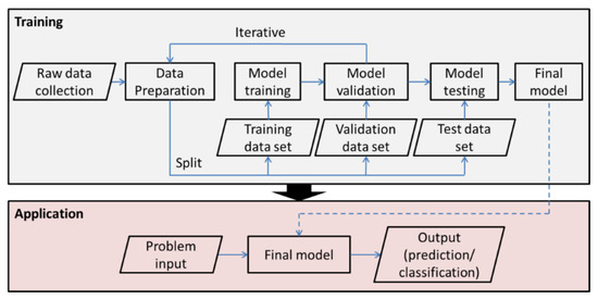 In general, the implementation of ML models involves a training phase before the models can be put to use. Figure 4 shows a typical implementation process for supervised ML. Data consisting of an input and target output pairs are required for the supervised training. The data are pre-processed (filtering, normalization, etc.) and split into training, validation, and testing data sets. A common ratio for the data split is 60% training, 10% validation, and 30% testing [26]. For the iterative cycle of model training and validation, the k-fold cross-validation and bootstrapping methods can be used [23,26]. The model is trained by minimizing an error or loss function, L(w), which measures the difference between the current model output (computed with the current set of internal adjustable parameters or weights, w) and the target output. The minimization of the loss function is done by adjusting the weights following the stochastic gradient descent procedure. For multi-layered networks, backpropagation is used to calculate the gradients in the minimization process [8,26]. After training and validation, the model is further tested on a test data set which has not been seen by the model. If the model produces satisfactory results on the test data set, then it is ready to be applied to real-world problems. The implementation of ML models and considerations in the training phase (e.g., learning rate, overfitting) are also detailed in [23,26].