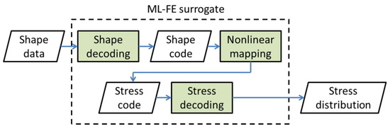 Liang et al. used DNNs to perform mechanical stress analysis in place of FE simulations for applications in biomechanics [56]. The researchers developed an ML model consisting of three modules with different functions: (i) shape decoding, (ii) nonlinear mapping, and (iii) stress decoding. The ML model was referred to as an “ML-FE surrogate” [56]. The model takes shape data as input and produces the corresponding stress distribution as output (Figure 6). The shape and stress codes are representations in the form of 1D vectors. A combination of supervised and unsupervised learning was employed. The researchers reported that the stress analysis results from the ML model are very similar to those obtained using FE simulations, with average errors below 1%. Moreover, using the ML model was reported to be much faster compared to FE simulations. Stress calculations that would take about 30 min to complete in FE simulations can be performed within 1 s using the trained ML model.