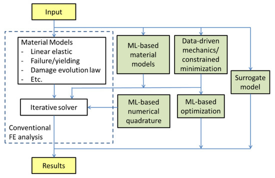 Figure 7 shows the various ML-based approaches for stress analysis that have been studied by researchers. In particular, studies on ML-based surrogate models [56,57] have proven the feasibility of using ML networks as substitutes for FE simulations for stress analysis. The short computation time required makes the ML approach very useful for the design phase of composite structures.