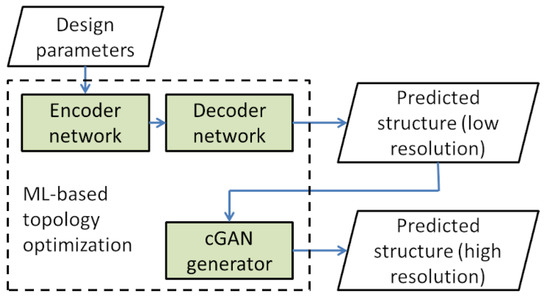An ML method for topology optimization was proposed in a recent study by Yu et al. [25]. The ML method consists of two stages/modules, namely a CNN-based encoder and a decoder network and a conditional GAN (cGAN) generator. The encoder and decoder network takes in the design domain, parameters, and constraints as input and outputs the optimized structure at low resolution. The low-resolution structure is then up-scaled to higher resolution using the cGAN generator. A schematic of the ML-based topology optimization method is shown in Figure 8.