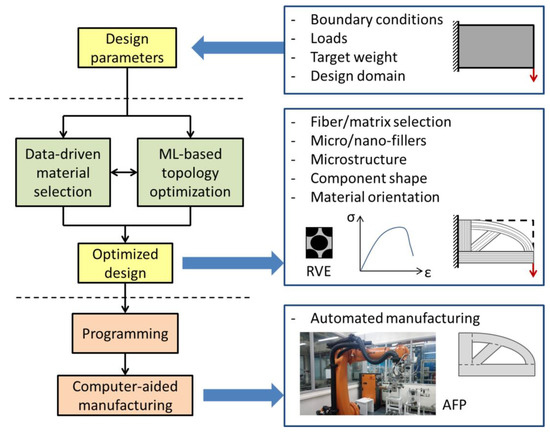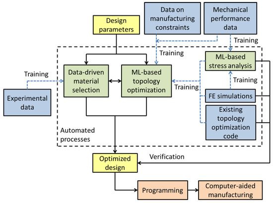 For the training of the design modules, experimental data including microstructure images, manufacturing constraints, and mechanical performance are required. Besides experimental data, numerical simulation results can also be used for the training of the topology optimization module. ML-based stress analysis (such as those in [56,57]) can be used to generate training data for the optimization module efficiently. The self-learning approach [49,50] can be applied to the training of the ML-based stress analysis and topology optimization modules, thus partially automating the training process. The topology optimization module outputs an optimized design which can be realized using CAM such as AFP or AM.