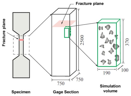 Location of the simulation domain relative to the gage section and fracture plane in the experimental specimen. All dimensions are in µm.