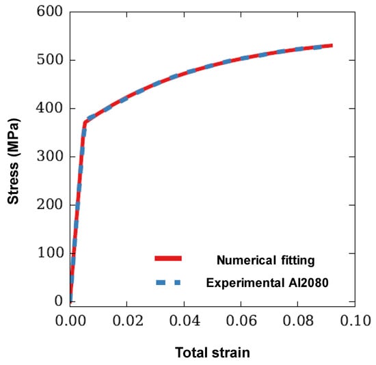 The SiC particles were modelled as exhibiting isotropic linear elastic response prior to fracture, with Young’s modulus and Poisson’s ratio of 410 GPa and 0.19, respectively [56]. A Weibull distribution (Equation (14)) can be used to estimate the fracture probability of SiC particles. The reference volume ‘’, characteristic strength ‘’ and Weibull modulus ‘’ should obey [52]. Gonzalez et al. [61] estimated these three parameters (, and ) for Al-SiC composite. The Weibull modulus ‘’, characteristic strength and reference volume ‘’ (set as average particle volume) were estimated to be 6, 1323 MPa and 7.53 µm3, respectively. In this work, the average particle volume is 16,800 µm3, the Weibull modulus is 6, and the characteristic strength is calculated to be 715 MPa based on the relationship of the three parameters. The Young’s modulus and Poisson’s ratio of the aluminum matrix were taken as 74 GPa and 0.33, respectively [56]. The tensile stress-strain curve of the 2080-T6 aluminum alloy was taken from [62] and fitted according to a nonlinear plastic law as = , where is the yield stress, is the plastic strain, C = 185.1 MPa, b = 23.9 and the initial yield stress is 370 MPa. Figure 2 compares the fitted stress-strain curve with the experimental data, which shows an excellent agreement between the two.