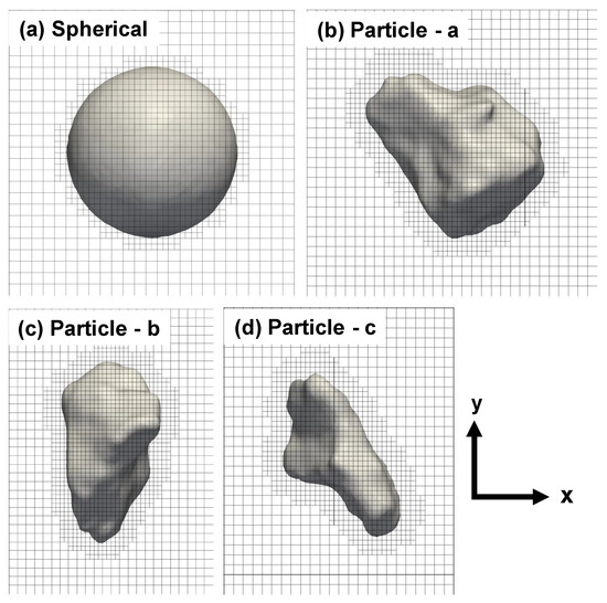 Therefore, the convergence rate of the fracture probability is α + 1, where α is the convergence rate of the derivative of fracture probability. Four particles with different geometries were used to study the convergence of , the X-Y views of which are shown in Figure 3. Figure 3a shows a spherical particle (ideal geometry) located at the center of a cube having length of 60 µm. The ratio of the particle’s radius over the cube length is 0.3 and the particle volume is 24,429 µm3. Figure 3b–d are three particles with realistic geometries. These three particles are shifted to the center and the domain lengths are chosen such that the same padding distance of matrix is maintained in the three orthogonal directions. The volume of the three particles are 27,143, 23,570 and 16,424 µm3, respectively. For all cases, only rigid body motions are fixed and traction is applied in Y direction. The applied traction is increased linearly from 0 MPa to 400 MPa in four load steps. Here, oct-tree mesh refinement is used and elements close to a material interface or inside a particle are refined with a single iteration of refinement.