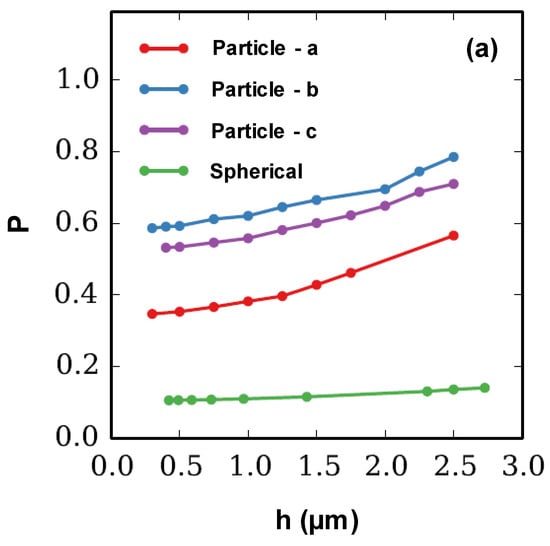 Figure 4b shows the fitted convergence rates for the four particles. The convergence rates of are close to 1, indicating that the error in the computed fracture probability decreases quadratically with respect to the element size, which is one order higher than the optimal, linear rate of convergence of the energy error norm for 8-node hexahedral elements. Figure 4c shows the relative probability error w.r.t. the element size used for particles. The relative error is calculated by the ratio of over the fracture probability when the element size is 0.5 µm. It is evident that the particles with the realistic geometries (Figure 4b–d) have higher probability error than the particle with spherical geometry (Figure 4a) with the same element size. When the element size is close to 1 µm, the probability error is less than 10%.