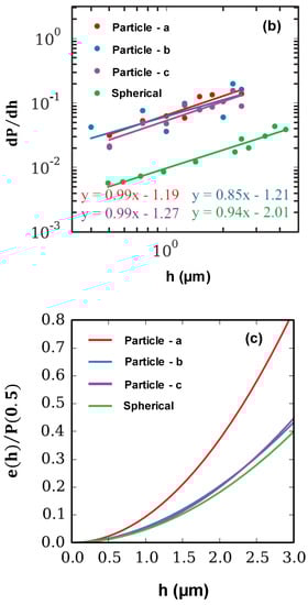 (a,b) Convergence of the derivative of Weibull fracture probability in particles with different geometries, and (c) corresponding estimated probability error.