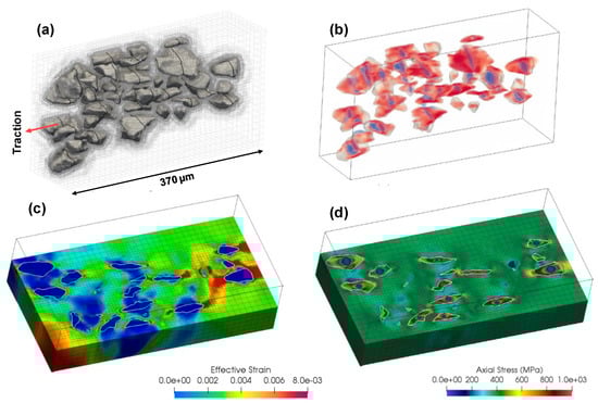 Figure 1 shows the domain size of the simulation volume and its relative position in the experimental specimen. Since the simulation volume is from the boundary of the gage section, symmetric boundary conditions have been applied in the fracture analysis and the traction is applied on the top surface of the simulation volume, as shown in Figure 1. Quasi-static analysis is performed and the traction is increased linearly from 0 to 405 MPa in 18 steps. Oct-tree mesh refinement applied to an initially uniform mesh of 19 × 10 × 37 elements, where elements that are intersected by a material interface or within particles are split into 8 child elements. After three such refinement iterations, the simulation volume is discretized using 560,226 elements, with a minimum element size discretizing the particles and their interface is 1.25 µm. Of the initial 41 SiC particles in the simulation volume, 31 fractured by the final load step. Figure 5a shows the 41 particles embedded within the mesh of the simulation domain, where the cleavage planes of the fractured particles are shown as black curves on the particle surfaces. Figure 5b shows the axial stress distribution on the particles, where blue color stands for zero stress (corresponding to crack surfaces) and the maximum axial stress is scaled to 1 GPa. The normal direction of fracture surfaces is computed by Equation (15) and the numerical normal directions are aligned nearly with the loading direction. Figure 5c,d show contours of the effective strain and axial stress fields on a cut plane of the domain at the end of the final load step, respectively.