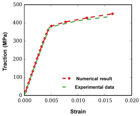 Figure 6 shows the comparative plot of experimental and simulated stress-strain curves of the composite. In the experiment, the onset of damage in the specimen was observed to begin close to 440 MPa [56]. In the numerical model, the same simulation volume and mesh scheme were used; however, the traction was increased from 0 to 450 MPa in 20 steps. It is clear from Figure 6 that there is a good agreement between the simulated and experimental stress-strain curves, however the simulated stress is slightly larger than the experimentally measurements yielding, which can be attributed to several assumptions made in the model. First of all, only crack initiation by cleavage fracture of particles is considered, whereas the particle and matrix are considered to be perfectly bonded and the matrix is idealized without fracture. However, in the experiment, localized void growth are observed which can increase the strain under the same traction [7]. These factors are likely the reason for the slightly higher traction values in the simulation after yielding.