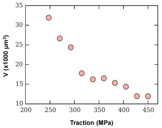 There are 41 particles in the simulation volume and the particle volume ranges from 1421 to 36,350 µm3. As the Weibull fracture model can account for the particle size effect automatically, large particles tend to fracture before small particles. Figure 7 shows the average volume of fractured particles with the applied traction. It is evident from Figure 7 that the particles start to fracture as soon as the applied traction reaches to 247.5 MPa. As the applied traction increases, smaller particles fracture, leading to a decrease in the average volume of the fractured particles (Figure 8).