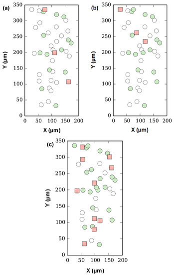 Graphical representation of the relative position of centroids of SiC particles on a projected XY plane when (a) Traction is 337.5 MPa, (b) Traction is 360 MPa, and (c) Traction is 405 MPa. Solid circles in white represent particle centroids that are not cracked. Green circles and red squares are particle centroids that are "previously" cracked and "newly" cracked, respectively, relative to the previous load step.