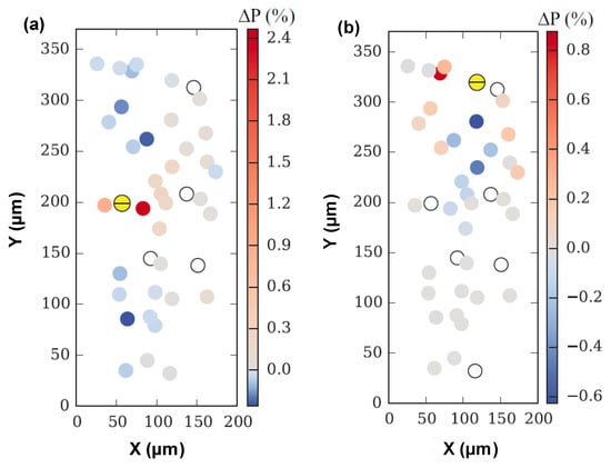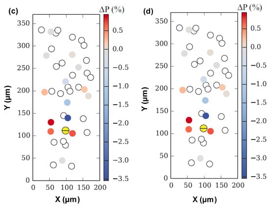 In order to study the influence of one cracked particle on others, the change in the fracture probability () of the intact particles were calculated before and after the fracture of a single particle. Figure 9 shows the centroids of particles, along with their , projected on a XY plane. Figure 9a–d show the distribution of ∆P of the centroids of un-cracked particles after four different particles have fractured. Note that the newly cracked particles are denoted as yellow circle with a black line, white circles are previously cracked particles and rest are un-cracked/intact particles. It is clear from Figure 9 that the fractured particle can influence the fracture probability of the near-by particles. The fracture probability tends to increase for a particle that are close to the newly cracked particle and are on the same XZ plane (perpendicular to the loading direction). This tendency is straightforward to understand because as soon as one particle breaks, the remaining particles on the same XZ plane have to support extra stress.