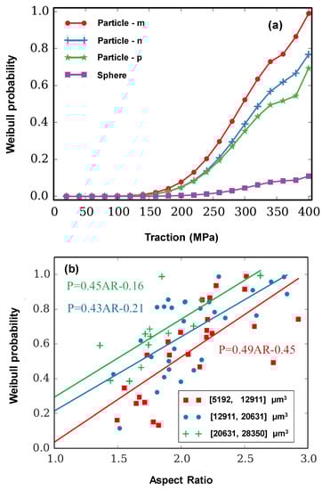 In order to evaluate the influence of particle geometry on the particle fracture probability, Weibull fracture probability versus applied traction was studied for different particle geometries (Particle-m, Particle-n and Particle-p, as shown in Figure 10). In this case also, each particle is shifted to the center of the simulation volume and the domain sizes are set to maintain a constant fill ratio for all cases. As shown in Figure 11a, the Weibull probability increases with traction much more rapidly for the real particles. Further, the three realistic particles exhibit much higher Weibull probability compared with sphere (ideal particle) when traction is higher than 200 MPa, indicating that the aspect ratio of the particles plays an important role on their fracture behavior. Note that the Particle-m and spherical particle exhibit the highest and lowest aspect ratio, respectively. The particle aspect ratio is calculated by the ratio of the longest Feret distance over the shortest Feret distance. Particle-m has a narrow volume and its fracture probability is the highest among all the studied particle geometries at the same traction. The lowest Weibull probability was observed for the spherical particle indicating that the particles with the smallest aspect ratio (i.e., 1 for sphere) are less prone to fracture. In order to further understand the influence of particle geometry on the fracture probability, the Weibull probabilities about one hundred particles, having a range of aspect ratio, were calculated at the applied traction of 400 MPa. The particle volumes range from 5192 µm3 to 28,350 µm3. As shown in Figure 11b, particles are separated into three groups with equal volume interval. It is clear that larger particles exhibit higher fracture probability and the slopes of the fitted curves for the three volume intervals are close to each other. This is attributed to the higher probability of the presence of the Griffith’s crack in the larger particles. In addition, SiC particles with larger aspect ratios show higher Weibull probabilities than the particles with lower Weibull probabilities indicating that the particles exhibiting higher aspect ratios are more prone to fracture. Overall, the larger particles with higher aspect ratios exhibit higher Weibull probabilities and are more prone to fracture, which is in complete agreement with the observations made in experiment [7].
