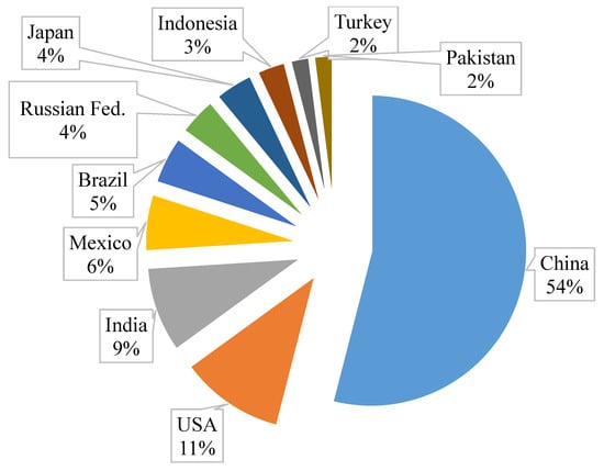 The top 10 egg-producing countries are presented in Figure 2 and Table 1. Roughly 30% of eggs are sent to breaker plants for processing into liquids [31]. The amount of calcium carbonate (CaCO3) from eggshell waste that could be recuperated are outlined in Table 1.