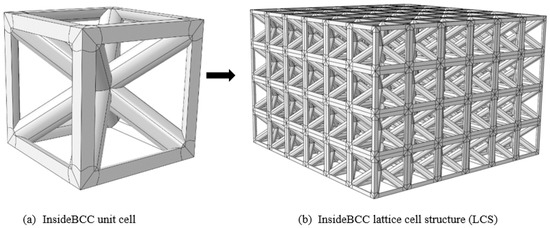 Lattice cell structures (LCS) are the engineered porous structures that are composed of periodic unit cells in three dimensions. Such structures have many scientific and engineering applications, such as in thermal systems, gas technology, mechanical and aerospace structures, etc., for which lightweight, high strength, and energy absorption capabilities are essential properties [1,2,3,4,5,6,7,8]. Additionally, combining different unit cell configurations, such as a frame structure and a body-centered cubic (BCC) structure (Figure 1), will provide higher strength and higher stiffness LCS. Such a combined LCS is termed as InsideBCC in this paper. It has been shown that the combining unit cells such as lattice structures inside the tube, BCC with vertical struts at each node, BCC with vertical struts in alternate layers, and BCC with gradient distributed vertical struts, contribute to the buckling and bending resistance and enhancement in energy absorption performance as well as the high specific strength and stiffness [9,10,11,12].