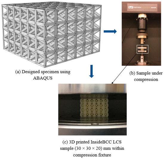 The micromechanics ABAQUS software 6.17 was used to design all models for finite element (FE) simulation [17], printing purposes, and implementing experimental tests. The micromechanics technique has more flexibility for creating hexahedral mesh elements to increase the accuracy of results. InsideBCC unit cell was designed by micromechanics ABAQUS, as illustrated in Figure 3a. The dimensions of a single InsideBCC unit cell are 5 mm × 5 mm × 5 mm with a truss diameter of 1 mm. The overall dimensions to create the lattice structure of InsideBCC were 30 mm × 30 mm × 20 mm in x, y, and z-directions respectively as shown in Figure 3b. The configurations of InsideBCC geometry that were designed by micromechanics technique software are saved in stereolithography (STL), which is a format used to define the sample geometry of a 3D printer software Stratasys Catalyst [18]. These samples were fabricated by a fused deposition modeling (FDM) based uPrint SE plus 3D printer [19] using acrylonitrile butadiene styrene (ABS) material. Furthermore, the printer nozzle temperature of 300 °C and the chamber temperature of 77 °C were maintained, which were used as default temperature settings for all the specimens that were printed. Three samples were fabricated to conduct the experimental quasi-static compression test for validation of the results obtained from both the FEA models of equivalent solid material and whole lattice structure. Those specimens were fabricated with support material, which was removed using a Stratasys cleaning apparatus, SCA, 1200HT [20]. The printing parameters selected for this research were based on the references [9,10,16,21].