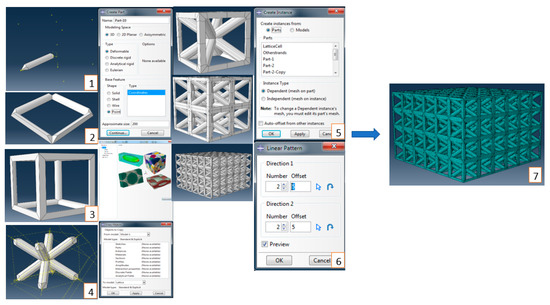 Both the InsideBCC unit cell (for steps a and c in Section 2) and LCS (for step d in Section 2) were designed and meshed using the intervention technique, which was developed in the micromechanics technique of ABAQUS/CAE 6.17 software. The developing micromechanics technique (DMT) has drastically simplified the selection of element types during mesh generation for a combining cellular structure. The DMT method addresses the challenges associated with the complexity of the InsideBCC unit cell and LCS to generate hexahedral mesh. The general process flow of the DMT method is schematically illustrated in Figure 5 in which the InsideBCC unit cell and LCS were designed and meshed. Seven essential steps are to: (1) create the single strut by using five points in one plane as a deformable coordinates point; (2) create four struts as a basis of a frame; (3) generate the frame by a mirror and then by using cell partition, which is defined as a cutting plane in order to complete the whole frame; (4) as a separate process, generate a single BCC unit lattice cell; (5) join the BCC unit cell inside the frame to create the InsideBCC unit cell; (6) using the linear pattern in order to generate the number of unit cells in all direction x, y, and z; and (7) finally, generate mesh using mesh controls by selecting the Hex option.