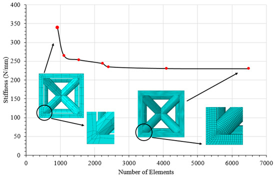 Since meshing is significantly better at providing accurate results, both mesh sensitivity analysis and the type of mesh generation were considered. To achieve FEA with high performance, in this work, a mesh sensitivity analysis was performed on a unit cell. Accordingly, mesh sensitivity was performed by observing the stiffness versus the total number of the elements under compression, which is illustrated in Figure 6. Additionally, this curve illustrated the mesh convergence that occurred when the mesh size decreased from 1.25 (coarse) to 0.19 (fine) when the percentage variation of stiffness was within 2%. Based on this percentage, the acceptable mesh size chosen from the mesh convergence study was 0.35 mm, the total number of elements was 2400 elements, and the amount of stiffness was 230.39 N/mm. A discretized model shows the acceptable mesh size employed for the InsideBCC model is illustrated in Figure 6 as an insert. In this research, the same procedure was followed to perform the mesh sensitivity analysis for all FE models.