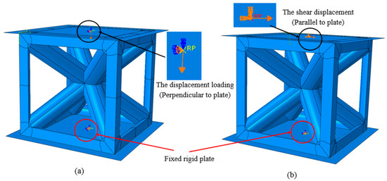 In the current research, for the aim of capturing the behavior of the entire heterogeneous cellular structures based on the analyses of the InsideBCC unit cell, only the periodic boundaries would suffice. Regarding both the elastic modulus and Poisson’s ratio, the lattice unit cell faces are free to move, including all translational and rotational degrees of freedom with respect to rigid plates as illustrated in Figure 7a. Typically, the rigid plate is a non-deformable plate when subjected to any certain load. Consequently, the applied displacement load with a specific amount on the reference point of the rigid plate will be distributed with the same value for the entire plate. To determine the elastic modulus and Poisson’s ratio, a compressive displacement was applied on one face (here, the top plate in Figure 7a toward the opposite face (here, the bottom plate in Figure 7b in the downward direction)). The reference plate on the bottom plate was to be fixed in all three directions as illustrated in Figure 7a. For the shear modulus simulation, the model was placed between two rigid plates, where each of the opposite unit cell faces were clamped with the corresponding plates as illustrated in Figure 7b. Shear displacement was applied on the top plate while the other face was kept fixed for all degrees of freedom as shown in Figure 7b. The displacement loading was applied using the dynamic explicit FEA simulation.