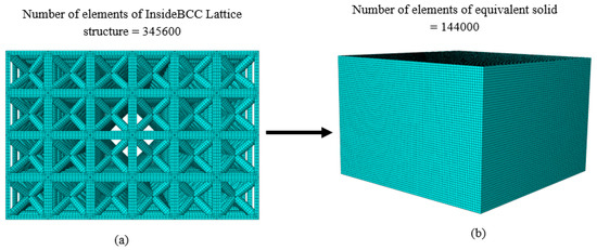 To demonstrate the performance of development of an elastic material model for InsideBCC lattice cell structures, two separate finite element models were developed under the compression load: one with a 6 × 6 × 4 cell InsideBCC lattice structure (for step d in Section 2) and one entirely solid (for step e in Section 2). The optimized discretized simulations of a 30 mm × 30 mm × 20 mm combining a lattice structure with a 5 mm × 5 mm × 5 mm unit cell having a strut diameter of 1 mm (Figure 8a) and 30 mm × 30 mm × 20 mm equivalent solid material (Figure 8b) are illustrated in Figure 8. The heterogeneous LCS in Figure 8a and the equivalent solid material in Figure 8b were simulated with hexagonal elements. The LCS model was generated and meshed using the DMT micromechanics technique as described in the previous section. Interestingly, the study of the mesh optimum sensitivity analysis shows the number of elements for the heterogeneous lattice structure model was 345,600 while the number of elements for the solid material model was 144,000, illustrated in Figure 8. In addition, the time required for that study to generate the mesh and seed part for the LCS model was about 12 h without running the FE simulation while the time required for creating the solid material model was about one second.