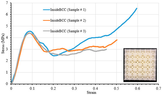 For InsideBCC configuration, load–displacement data from three samples (experimental) were plotted in one diagram to investigate the specimen to specimen variation under the compression load. The stress–stain behavior of three InsideBCC samples is illustrated in Figure 10. In this paper, the mechanical behavior of InsideBCC configuration under the compression load within the elastic limit was discussed. In other words, the elastic limit until the yield point was considered, which means the stages of lattice cell failure were not included in this study.