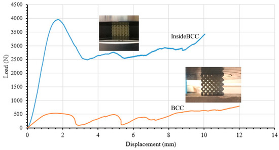 Representative load–displacement behavior of both BCC and InsideBCC ABS samples were plotted together to compare the variation of compression behavior, which is illustrated in Figure 11. For the BCC sample the maximum failure or peak load was about 500 N while the InsideBCC sample was about 4000 N. Thus, it could be concluded that the InsideBCC lattice cell structures involving vertical and horizontal struts shows enormously higher stiffness and failure load than the BCC geometry. Additionally, from the area under the load–displacement curve, the strain energy absorption is lowest for the BCC feature, while the InsideBCC configuration had the largest one. Stiffness, failure load, and energy absorption for various parameters such as the strut diameter, cell size, and processing factors will be further investigated by developing a surrogate model using the intelligent method. The improved mechanical performance of InsideBCC LCS can be used for specific applications that required unique load–displacement characteristics.