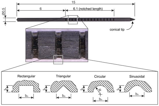 Z-pins with rectangular, triangular, circular and sinusoidal notch designs have been investigated. The notched area starting 6 mm away from the non-sharpened face of the z-pin has a length of 6.1 mm and is defined by the depth tn, the width bn and the distance (width between the notches) dn of the notches. An overview of the notch geometries investigated as well as the number of specimens is summarized in Table 1.